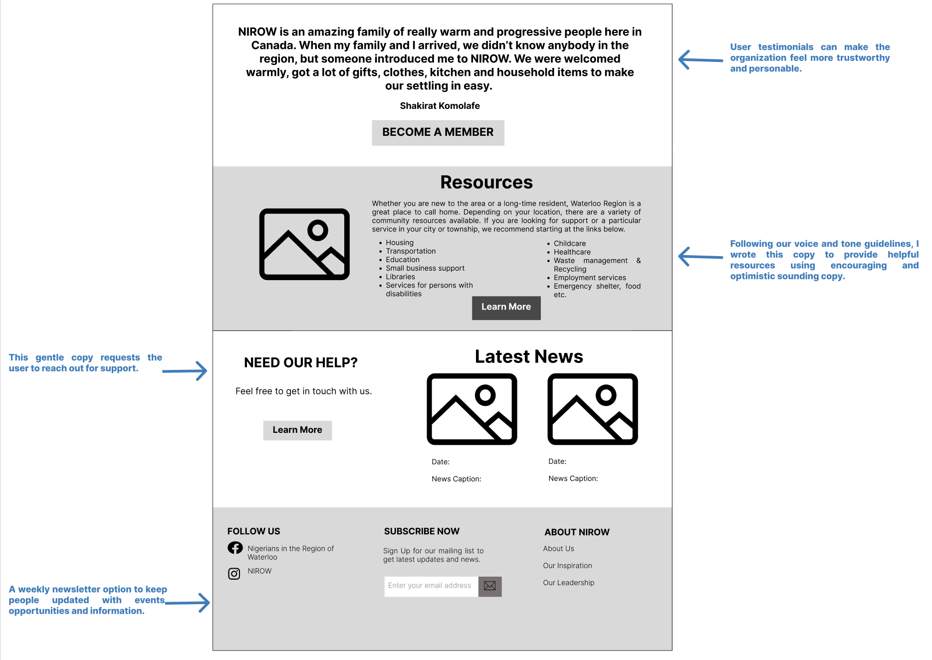 My team and I determined that the new home page should immediately promote what NIROW stands for, joining as a member and avenues to reach out. As the users scroll down on the landing page (wireframe below), they would see more helpful settlement resource links, user testimonials, the contact to reach out for support, as well as joining a weekly newsletter for updates.
