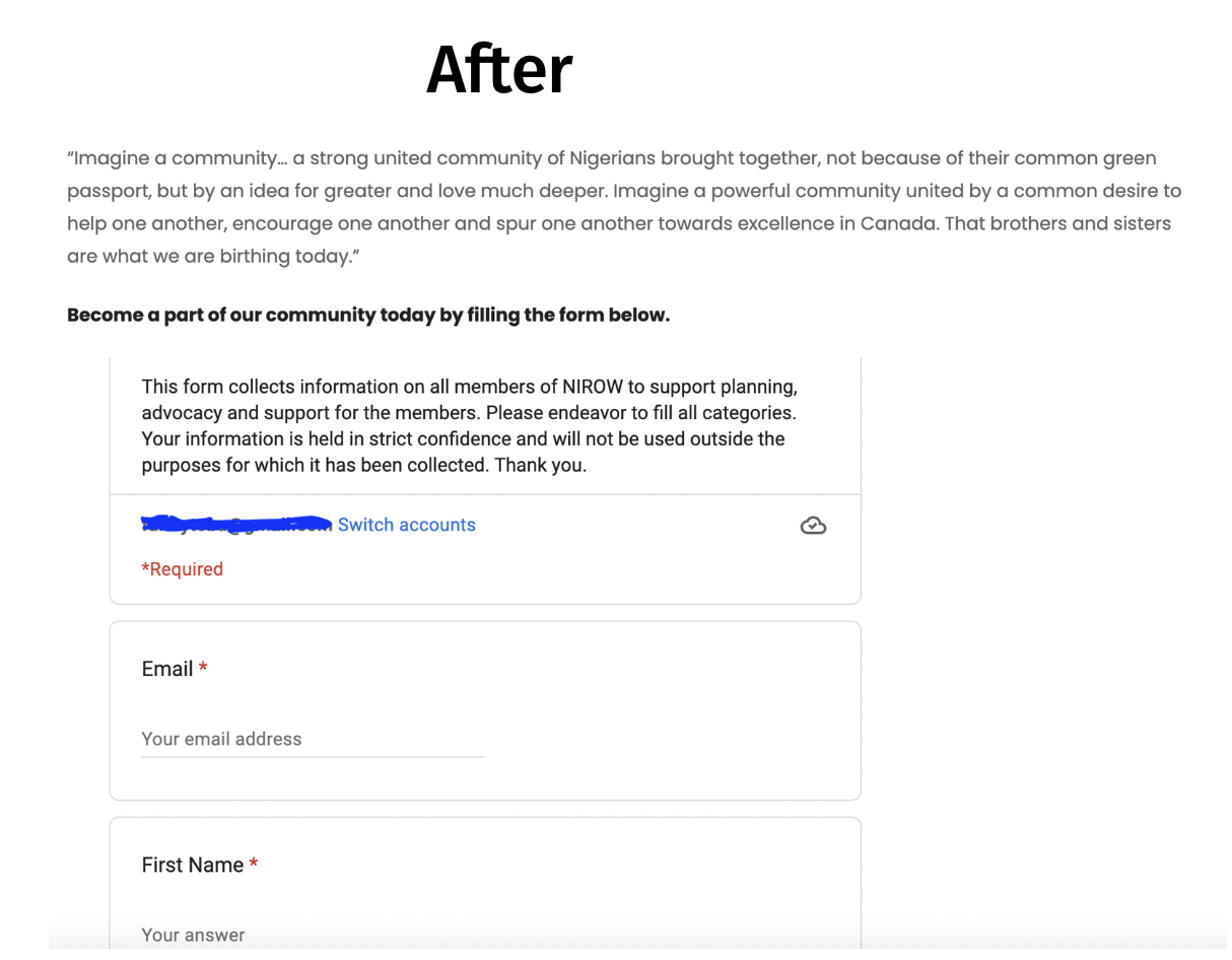 Joining NIROW as a member is considered a success metric by the client. The website had a membership form that was not engaging and did not look visually attractive. On the client’s request, we used Google Forms.