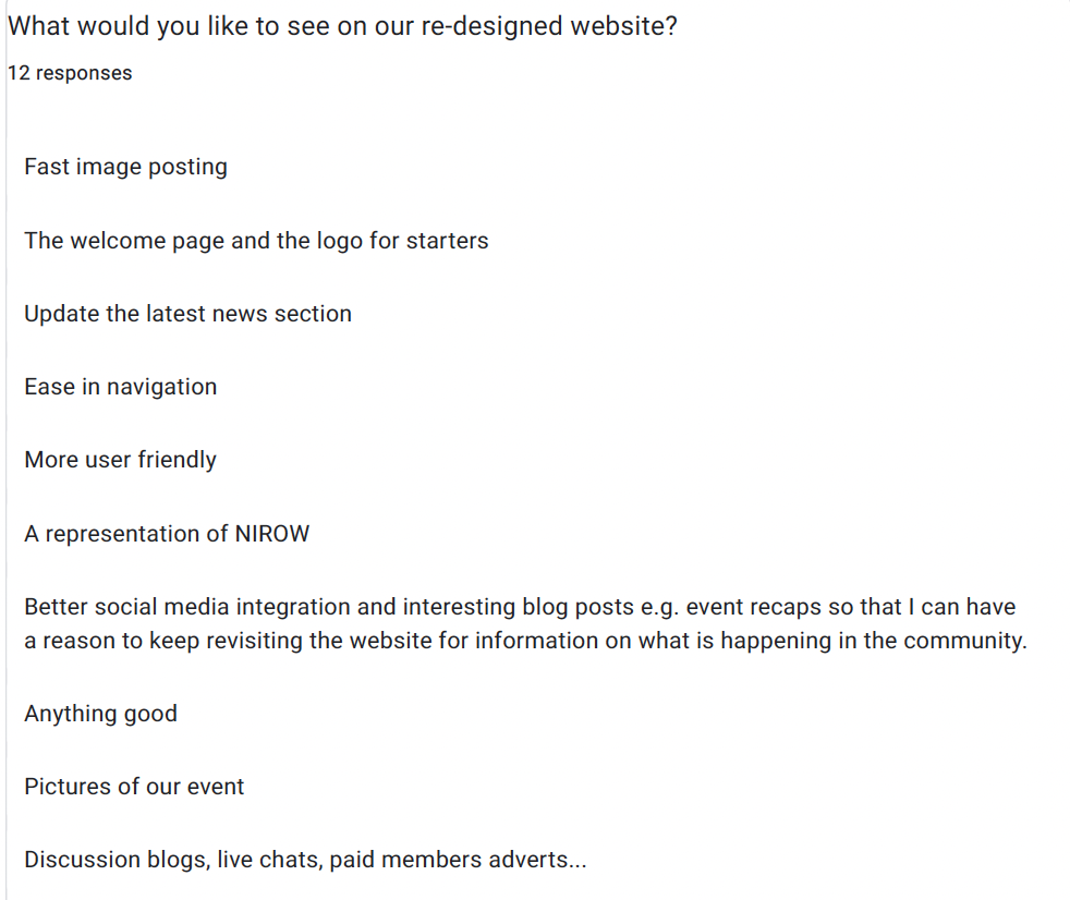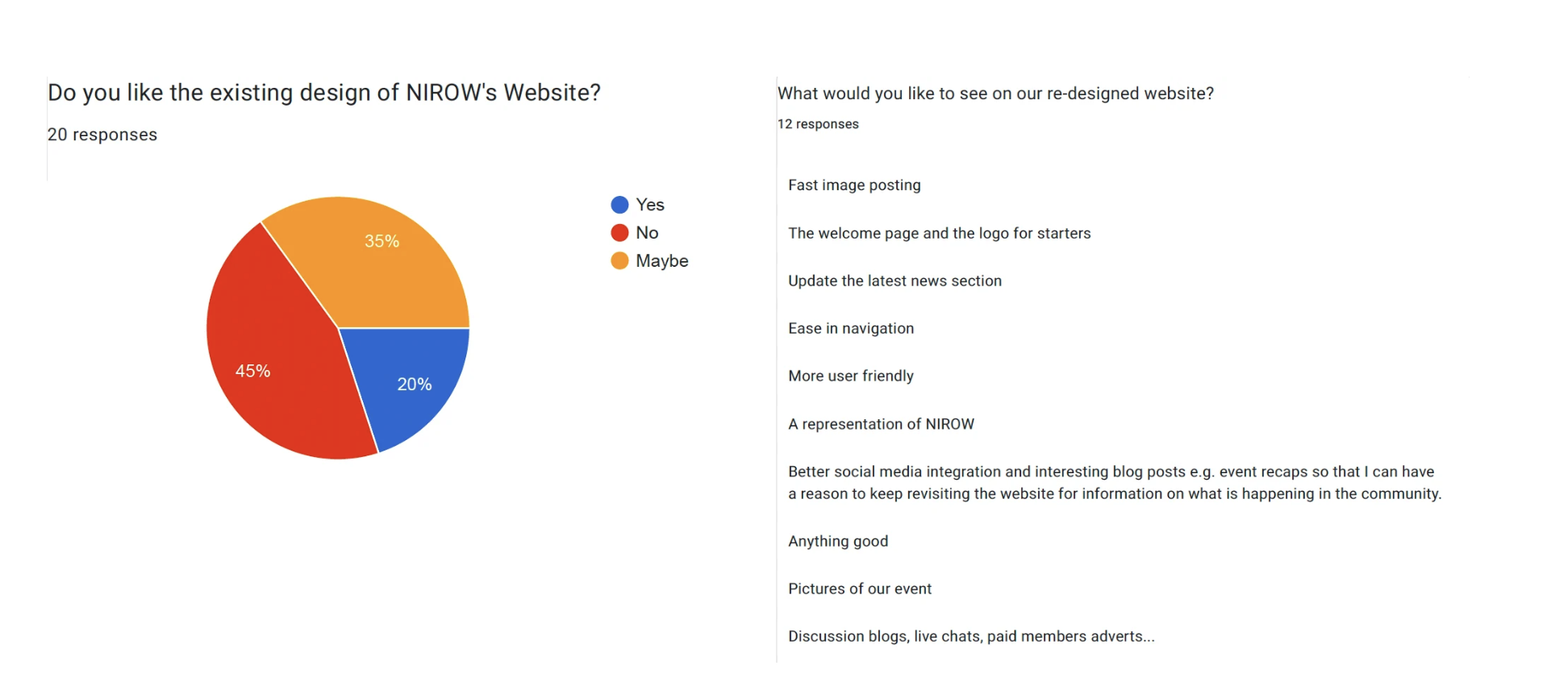 To understand NIROW member expectations, my team and I surveyed 20 members. I developed and distributed the survey questionnaires using Google Forms. Questions included members' reasons for joining NIROW, visiting the website, and preferred changes.