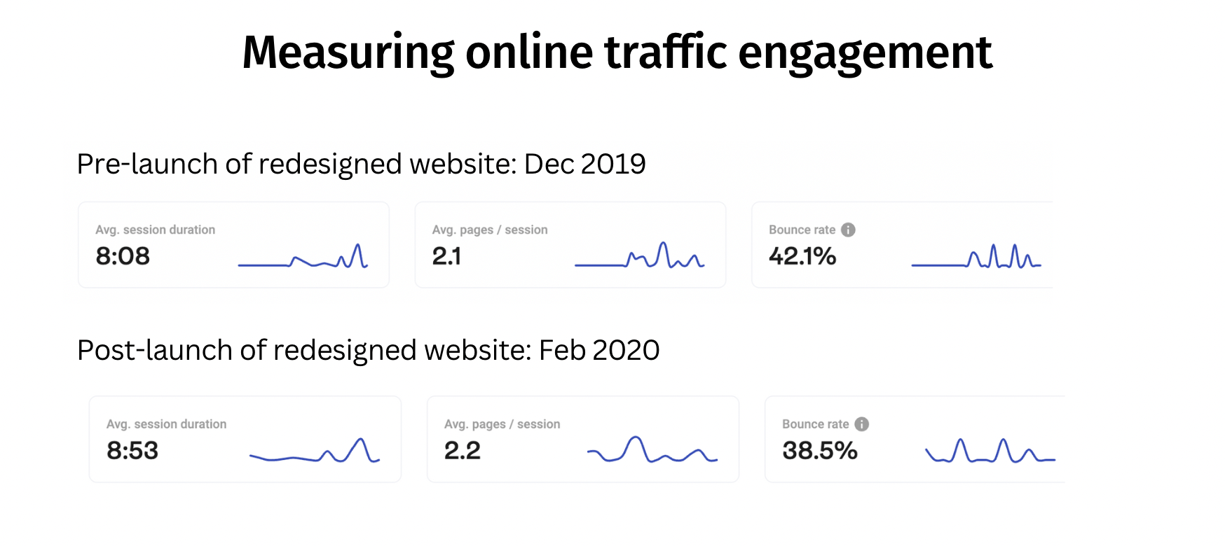 The bounce rate dropped 3.6% within 3 weeks of launching the website. For industry standards, a good bounce rate ranges between 20-40%.